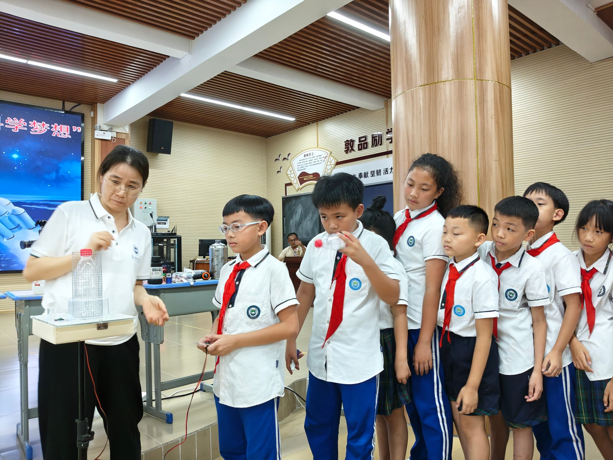 科普基地劳邦盛、韩秀萍、杨晓红、于雪玥四位老师通过酒精燃烧实验、过氧化氢分解演示等直观操作,将火箭推进剂的化学原理转化为可见的火焰与气流,200余名四年级学生化身“小小化学工程师”,在互动问答中破解“燃料如何挣脱地球引力”的科学密码。