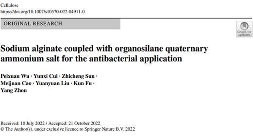 化学工程与技术学院周阳教授课题组在国际权威Top期刊《Cellulose》上发表了最新研究成果“Sodium alginate coupled with organosilane quaternary ammonium salt for the antibacterial application”(海藻酸钠与有机硅烷季铵盐偶联的抗菌应用)。私人直播