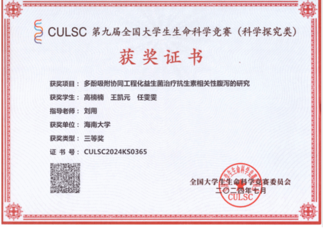 应用化学专业2022级本科生高楠楠、王凯元、任雯雯的参赛作品“多酚吸附协同工程化益生菌治疗抗生素相关性腹泻的研究” (指导老师:刘用)荣获全国三等奖、省级二等奖。