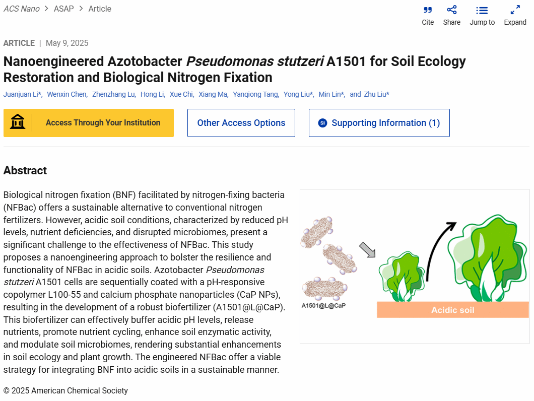 近日,生物材料与电子器件团队刘用副教授在ACS Nano上在线发表了题为Nanoengineered Azotobacter Pseudomonas stutzeri A1501 for Soil Ecology Restoration and Biological Nitrogen Fixation的研究成果,开发了一种改善酸性土壤环境的表面工程固氮益生菌,用于促进作物在酸性土壤中的生长和土壤生态恢复。