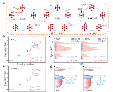 孙萍萍和文伟等报道了一种AEM衍生的质子受体-电子供体机制(PAEDM),该机制通过构建RuO2 (表示为C,Ta-RuO2)的间质-替代混合固溶体结构,可以打破活性-稳定性权衡,从而实现优异的酸性OER性能。原位表征和理论计算显示,C,Ta-RuO2催化剂遵循PAEDM,绕过*OH和*OOH之间的线性关系,对OER具有较低的能垒。