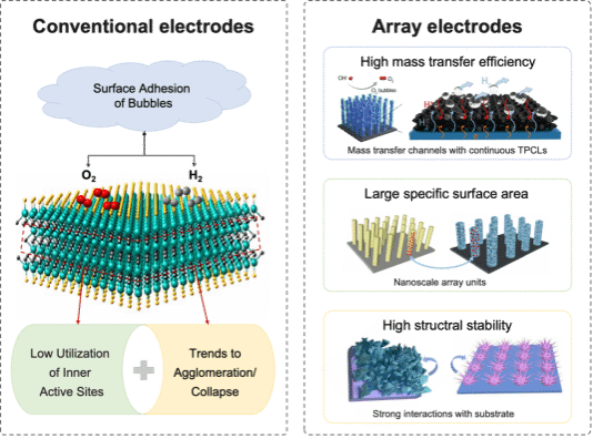 图2 与传统电极相比,阵列电极在涉及气体的电催化反应(OER/HER/ORR)中的主要优势示意图