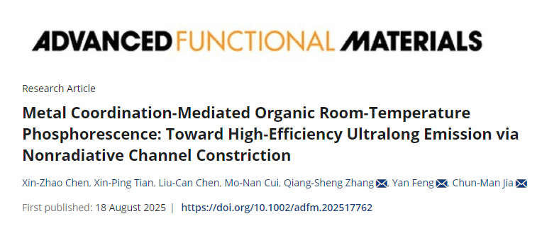 论文信息:Xin-Zhao Chen, Xin-Ping Tian, Liu-Can Chen, Mo-Nan Cui, Qiang-Sheng Zhang*, Yan Feng*, Chun-Man Jia*. Metal Coordination-Mediated Organic Room-Temperature Phosphorescence: Toward High-Efficiency Ultralong Emission via Nonradiative Channel Constriction. Advanced Functional Materials 2025, e17762. DOI: 10.1002/adfm.202517762