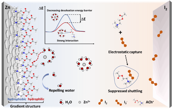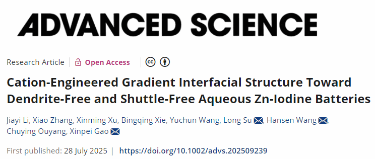 能源胶体与界面化学团队在《Advanced Science》上发表题为“Cation-Engineered Gradient Interfacial Structure toward Dendrite-Free and Shuttle-Free Aqueous Zn-Iodine Batteries”的研究论文。该研究提出了一种“双电层(EDL)定向调节”策略,利用两亲性乙酰胆碱阳离子(ACh)在电极-电解质界面构建了疏水-亲水梯度结构,实现了长寿命水系锌-碘电池。