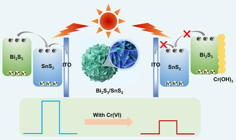 工作2:以钙钛矿氢氧化物ZnSn(OH)6为前驱体,采用连续离子层吸附反应法构建了三维花状SnS2/Bi2S3异质结,使用该异质结构筑的光电化学传感实现了Cr(VI) 的灵敏检测。该成果以题为“Perovskite hydroxide ZnSn(OH)6-derived three-dimensional flower-like SnS2/Bi2S3 heterojunction for sensitive photoelectrochemical detection of Cr(VI)”发表于《Rare Metals》期刊。私人直播