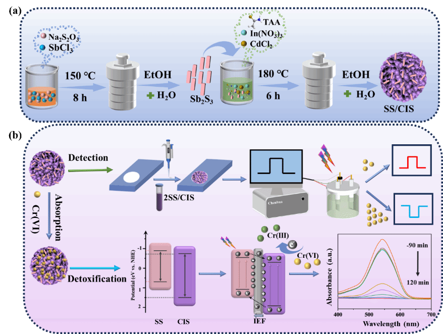 工作1:设计合成了一种双功能Sb2S3/CdIn2S4 p-n异质结,同时实现了Cr(VI)的光电化学灵敏检测和光催化解毒。所制备的光电化学传感器在稳定性、选择性和重现性方面均达到实用水平,在环境领域展现出重要应用潜力。该成果以“Difunctional Sb2S3/CdIn2S4 p-n Heterojunction: A Novel Material for Ultra-Wide-Range Photoelectrochemical Sensor with Photocurrent-Polarity Switching and Photocatalytic Detoxification of Cr(VI)”为题发表于《Chemical Engineering Journal》期刊。私人直播