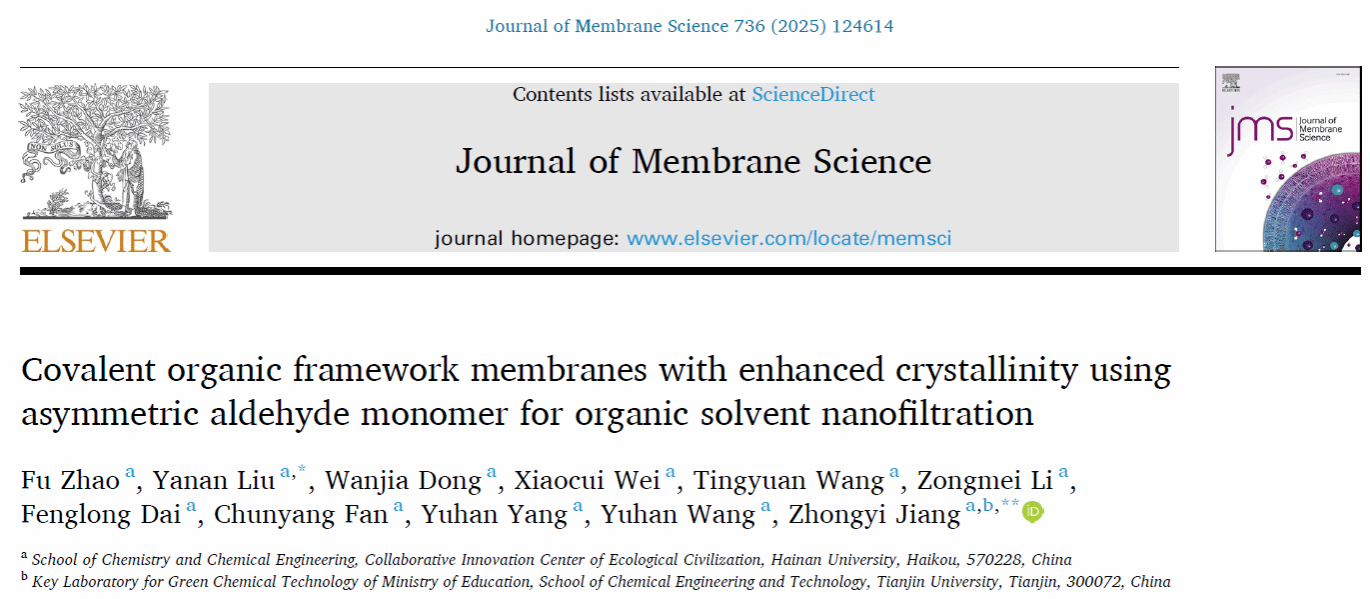 近日,姜忠义教授课题组在期刊《Journal of Membrane Science》(IF = 9.0)发表题为“Covalent organic framework membranes with enhanced crystallinity using asymmetric aldehyde monomer for organic solvent nanofiltration”的研究论文。教育部讲座教授姜忠义教授、私人直播