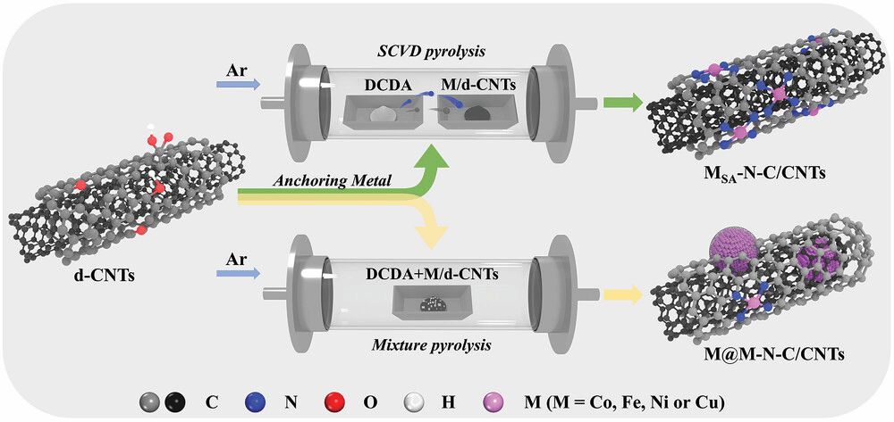 功能分子器件团队提出了一系列创新设计策略,以精准调控氧物种在活性位点上的吸附与还原行为。团队发展了一种基于“分离气相化学沉积”的普适性方法,在碳纳米管载体上构筑同轴钴-氮-碳单原子催化剂。所制备的同轴结构单原子催化剂在酸性电解液中展现出优异的氧还原活性、选择性与长期稳定性,实现了超过100小时的稳定高效电合成过氧化氢性能。相关成果以Coaxial Metal-Nitrogen–Carbon Single-Atom Catalysts Boost Acid Hydrogen Peroxide Production为题发表于材料领域中国科学院一区TOP期刊Advanced Functional Materials杂志,私人直播