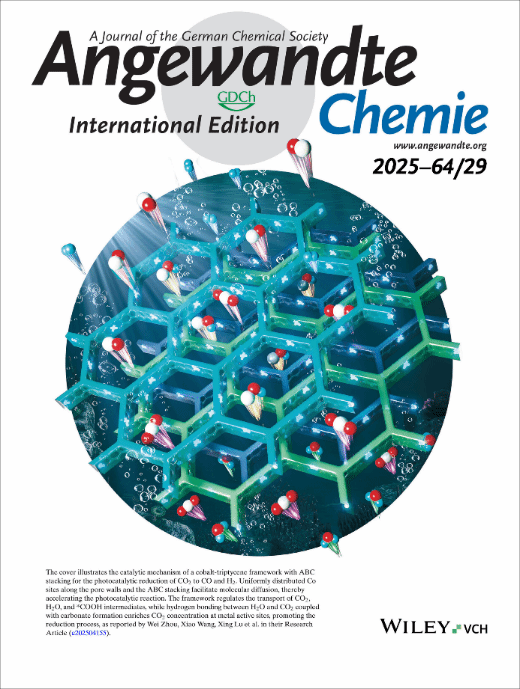 功能分子器件团队在化学领域中国科学院一区TOP期刊Angewandte Chemie杂志上发表了题为Staggered ABC-Stacking Cobalt-Triptycene Framework for Accelerating CO2 Photoreduction的研究论文,并被选为封面论文。该研究在纯水相中合成了错层ABC堆剁的钴基三蝶烯框架,实现了高达90%的产率且具备一定的环境兼容性(在东坡湖、白沙门公园等自然水域采集的水样中亦可合成)。进一步地,研究团队通过密度泛函理论计算与分子动力学模拟和主成分分析进一步发现,CO生成速率与Ik值、光学带隙及ΔG*H等因素呈现强相关性,由此修正了以往认为ΔG*COOH是光催化性能主要因素的观点。这项研究为高效二氧化碳还原光催化剂的设计原理提供了理论依据。卢兴教授组2025级博士研究生吴俊豪、硕士研究生卢鑫慧为该论文的共同第一作者,私人直播
