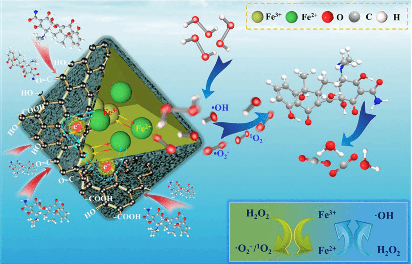 传统热解法制备的磁性生物碳常面临铁物种团聚、活性位点暴露不足及碳基质催化性能有限等问题,制约了其催化效率与稳定性。如何通过微观结构调控实现铁物种与碳基质的高效协同,构建具有多重活性位点的高性能磁性碳材料,是提升其类芬顿催化性能的关键挑战。本研究提出一种基于K2FeO4水热氧化磁化策略,通过一步水热法制备具有多重催化位点的磁性水热碳。K2FeO4同时作为铁源与氧化剂,在反应过程中调控碳基质结构,引入丰富的含氧官能团、持久性自由基与石墨缺陷,并促使磁性铁氧化物均匀负载于碳载体上,形成纳米异质结结构。表征与实验结果表明,该材料在宽浓度范围(50–200 mg/L)内对四环素具有高效降解能力(60 min内去除率达99%),并表现出优异的循环稳定性。自由基淬灭与ESR分析揭示了•O₂⁻、¹O₂与•OH等多种活性氧物种共同参与降解过程,且碳基质在促进Fe³⁺/Fe⟡⁺循环与电子传递中发挥关键作用。该研究为简便构建具有多重催化位点的磁性碳材料提供了新思路,拓展了其在复杂水体中有机污染物高效降解中的应用潜力。