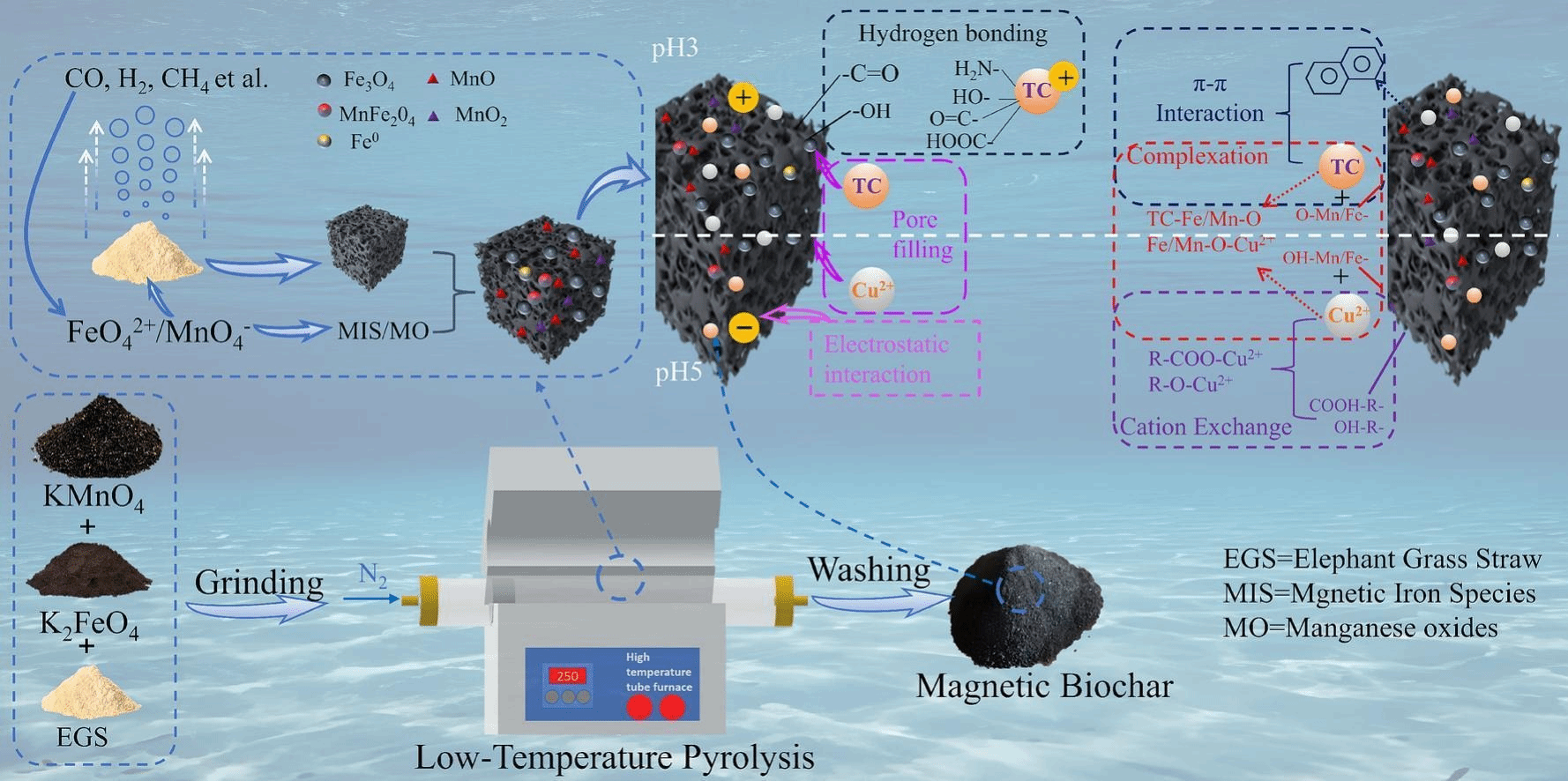 制备磁性生物碳的传统热解法通常需要高温(>500 °C)以实现铁盐向磁性铁物种的充分转化,此过程易导致功能基团大量分解及铁物种团聚,限制了其吸附容量与能源效率。因此,开发低温制备策略,在引入磁性铁的同时保留并构建丰富的表面活性位点,是实现高性能磁性生物碳低成本合成的关键挑战。本研究提出一种基于K2FeO4与KMnO4的协同共氧化热解策略,在低至250 °C的温度下成功制备出高性能磁性生物碳(MMB250)。该策略利用K2FeO4与KMnO4的强氧化性与碱性,协同促进生物质热解并产生大量还原性小分子,从而高效地将FeO42−与MnO4−还原为多种磁性铁物种及锰氧化物,并实现其均匀负载于碳基质。所制备的MMB250具有丰富的含氧官能团、发达的孔隙结构及高饱和磁化强度(21.79 emu/g),对四环素和Cu⟡⁺表现出卓越的吸附性能,最大吸附容量分别高达720.7 mg/g和267.9 mg/g。吸附机理研究表明,其对四环素的吸附主要依赖氢键/络合/π-π作用/孔填充,而对Cu2+的吸附则主要通过阳离子交换/络合/静电相互作用/孔填充实现。该材料在多种实际水体基质及共存矿物干扰下仍保持优异吸附能力,并展现出良好的循环再生性能。本研究为低温、低能耗制备高性能磁性生物碳提供了新策略,所制备的磁性生物碳在复合污染废水治理中具有极高的应用潜力。