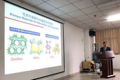 黄飞鹤教授为大家做了题为《柱芳烃纳客在吸附与分离中的应用》的报告,介绍了从石油化工混合物中分离得到纯的苯乙烯、二甲苯、烯烃等化工原料的方法,重点展示了柱芳烃非多孔自适应晶体(简称:纳客)在苯乙烯/乙基苯分离、对二甲苯纯化、1-戊烯/2-戊烯分离、甲基环己烷/甲苯分离、碘吸附等方面的应用,启发了大家对高效分离纯化石燃料方法的思路。报告会后黄教授与现场多位师生进行了热烈的学术交流与讨论。