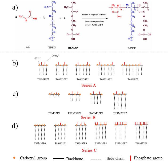 潘莉莎教授团队提出 “络合吸附-马兰戈尼效应” 策略,引入2-羟乙基甲基丙烯酸酯磷酸酯(HEMAP)作为功能消泡单体,经过水溶液自由基聚合成功合成低引气型聚羧酸减水剂(P-PCE),并通过调节聚醚大单体的聚合度以及甲基丙烯磺酸钠(MAS)和HEMAP的摩尔比对P-PCE的主链长度、侧链长度和磷酸根密度进行调控,其反应方程式和结构示意图如图3所示。