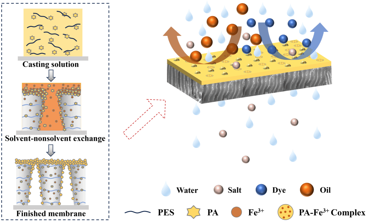 姜忠义教授团队提出了一种基于络合作用的反应增强表面偏析方法,用于制备面向分子/离子分离的抗污染纳滤膜。在铸膜液中引入亲水性植酸(PA)作为表面偏析剂,并在凝固浴中选用具有强络合能力的Fe3+作为交联剂。PA与Fe3+之间的络合作用增强了PA的表面偏析,使PA-Fe3+络合物稳定附着于膜表面,从而构建出亲水且交联的分离层。实验结果表明,优化后的膜表现出优异的性能:水通量为253 L/(m⟡·h·bar),对多种染料具有高截留率(甲基蓝:97.9%,日落黄:96.3%,酸性品红:95.5%,甲基橙:78.8%),染料/盐分离因子超过300,且在表面活性剂稳定的泵油水乳液过滤中通量恢复率超过95%。同时,在连续168小时过滤混合溶液(100 ppm甲基蓝/1000 ppm NaCl)过程中,该膜始终保持对甲基蓝的高截留率与对NaCl的低截留性能。私人直播