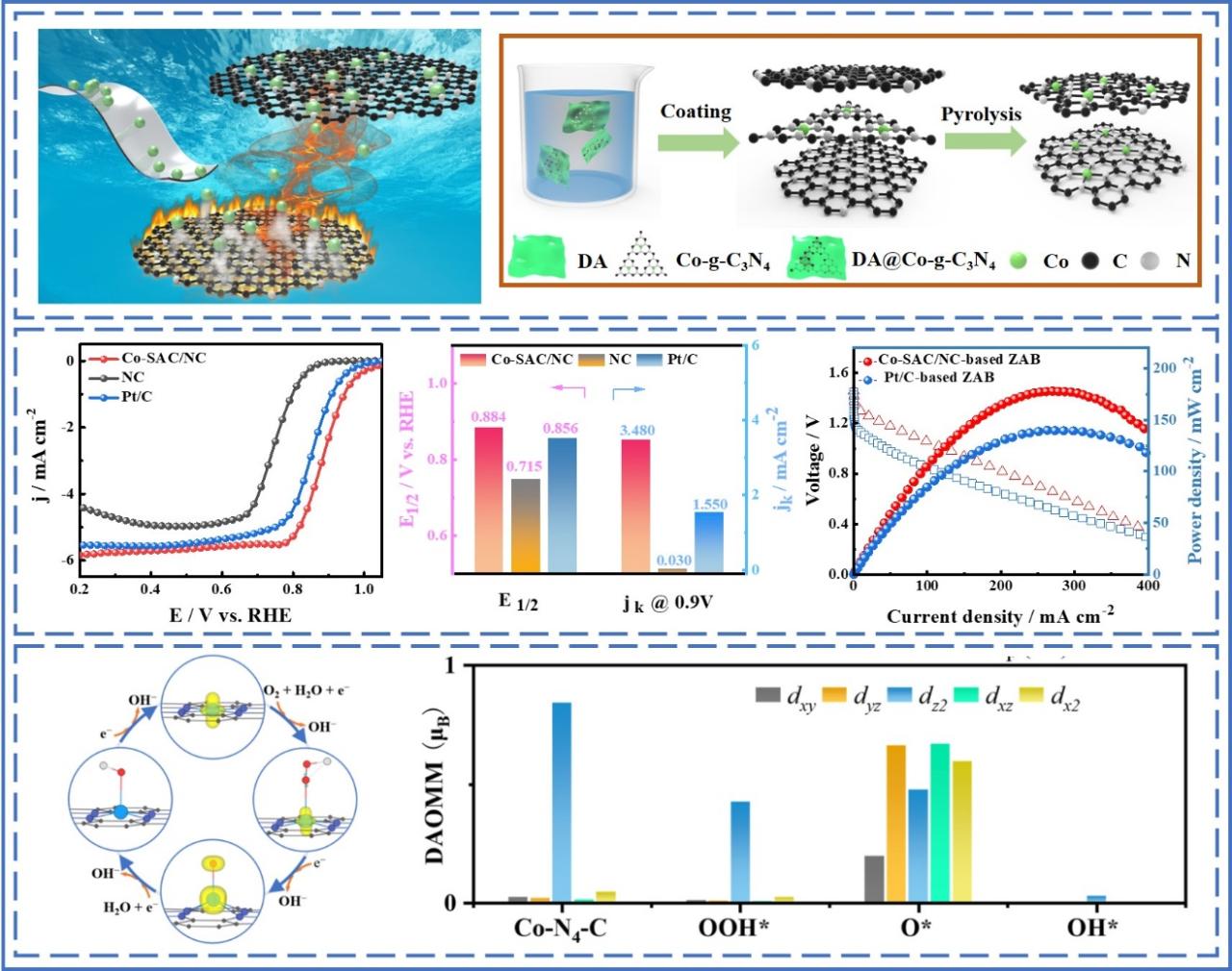田新龙教授团队报道了一种简便、高效的“转印法”策略实现单原子催化剂的可控制备。所制备的Co-SAC/NC催化剂展现出良好的电催化活性,在碱性电解质中具有0.884 V (vs.RHE)的半波电位和出色的耐久性。此外,以Co-SAC/NC为空气阴极催化剂组装的锌空气电池展现出优异的电池性能,峰值功率密度和比容量分别高达179 mW cm-2和757 mAh g-1。密度泛函理论计算证实了所制备催化剂的真正活性位点为Co-N4,并进一步揭示了Co位点的电子结构在氧还原反应过程中的动态演变特征。