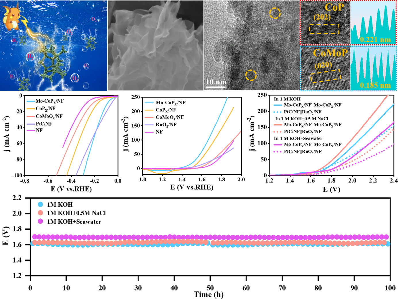 田新龙教授团队提出了一种原位水热与低温磷化相结合的策略制备了Mo修饰的CoPX纳米阵列(Mo-CoPX/NF)。该催化剂展现出优异的析氢(HER)、析氧(OER)以及全解海水性能。在10mAcm-2的电流密度下,HER和OER的过电位仅为82和268mV,在100h的稳定性的测试后其性能损失可忽略不计。此外,将所制备的催化剂应用于全解海水,在10mAcm-2对应的电位为1.61 V,明显优于贵金属催化剂,并在10mAcm-2下连续稳定运行100h,表现出优异的稳定性。这得益于其独特的自支撑纳米阵列,双金属活性位点以及P的引入,能够提供更大的比表面积,更多的活性位点和更高的耐腐蚀性。这项工作为设计高活性、高稳定性的非贵金属催化剂用于电解海水提供了一种新策略。