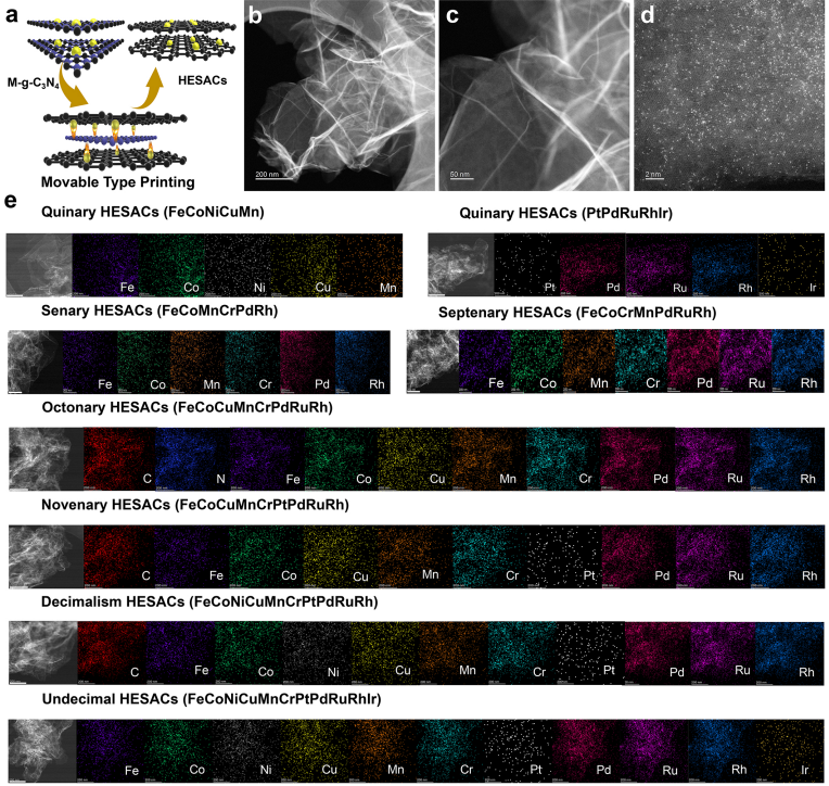 本文灵感来源于“活字印刷术”,报道了一种简便、高效的“点对点”印刷策略实现了单原子催化剂从五元到十一元的可控制备。作为典型案例,所制备的五元高熵单原子催化剂展现出了优异的催化活性,耐久性和器件性能。