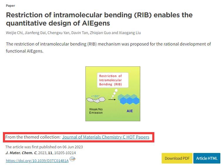 研究成果发表于国际著名期刊《J Mater Chem C》上,题为“Restriction of intramolecular bending (RIB) enables the quantitative design of AIEgens”,并被编辑选为热点文章。文章第一作者为私人直播