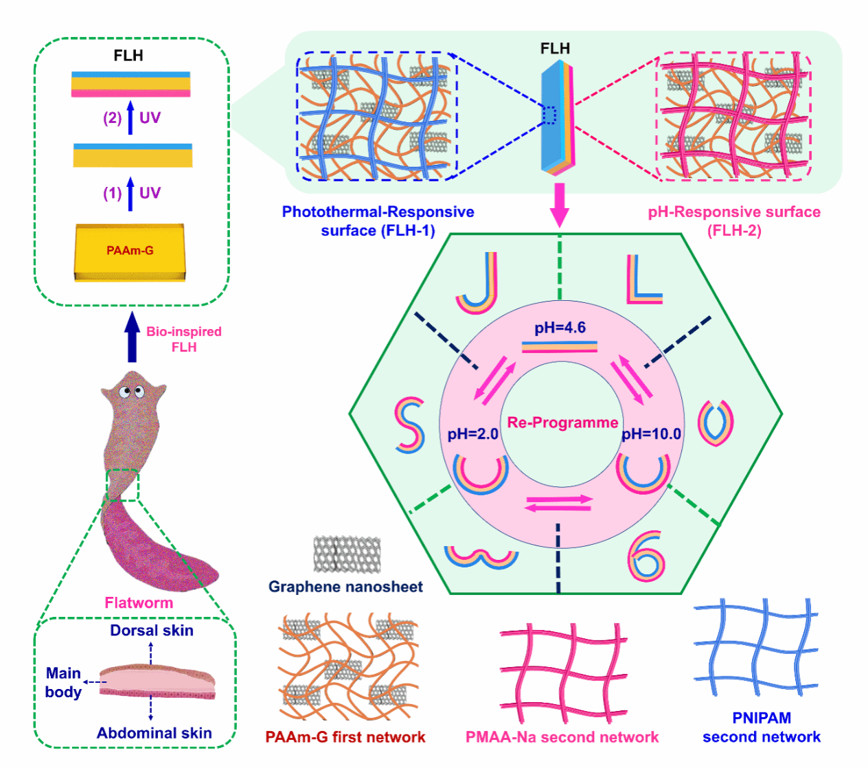 该FLH的设计灵感来源于生物界中扁虫的身体结构,基于聚丙烯酰胺-石墨烯(PAAm-G)基体单网络水凝胶的两个表面分别设计具有热响应性的聚(N-异丙基丙烯酰胺)(PNIPAM)和pH响应性的聚甲基丙烯酸纳(PMAA-Na)的不同双网络结构(恰如扁虫的腹部和背部不同的表皮结构),从而实现了对水凝胶仿生驱动的非接触式可重复编程(图1)。
