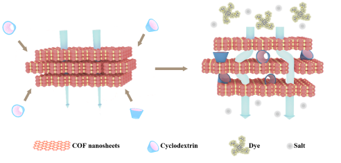 姜忠义教授团队将环糊精(CD)作为插层剂,引入相邻的COF纳米片中,以增加COF膜的层间距,形成丰富的传质通道,从而实现高效的染料和盐分离(图1)。此外,CD与COF纳米片之间的相互作用可以增强膜在长期测试中的稳定性。