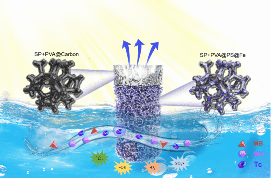 如图所示,将零价铁纳米颗粒与过硫酸盐等活性组分嵌入聚乙烯醇基质中,制备出一种稳定且可长期存放的海绵型气凝胶装置。当该装置投入受到污染的水体后,其表面与内部结构在水作用下转化为水凝胶,从而在无需额外添加外部化学试剂的条件下,直接触发活性自由基的产生。这些自由基可高效氧化和降解多种有机污染物,实现对复杂水体的净化。此外,该海绵材料在太阳能光照下还可发挥光热效应,对水分进行快速蒸发与收集,形成一种将降解与淡水获取“二合一”的集成式水处理方案。