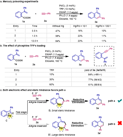 为了验证这一假设,作者进行了汞中毒实验及膦配体影响的探究实验(图3)。在反应体系中加入汞会使反应中止,随着加入汞的比例(根据钯计算)增加,反应停止时间越短。当使用100当量汞时,反应在10分钟后完全停止,3a产率为11%,继续延长反应时间产率没有增加(图3 a)。探究配体当量影响的实验结果,表明TFP量的增加时,产物3a的产率和选择性同时降低。在标准条件下,GC-MS检测不到异构体3a'和偶联副产物5,而当逐渐增加TFP当量时,可以检测到3a'和5的生成,且比例逐渐提高。根据已报道文献,过量的配体会抑制钯簇形成(图3 b)。因此,反应选择性下降可能是由于钯簇形成变缓慢所导致。根据实验结果证实,该反应是由钯簇介导的多相催化反应过程。高选择进行环化反应得到3a结构是电子效应和位阻效应综合作用的结果。端炔与关键中间体C进行环化时,与C(苯基)-Pd键相比,端炔插入C(烯基)-Pd键时位阻小。由于反应过程中形成了钯簇,位阻效应进一步增加,有利于提高反应的选择性(图3,c)。