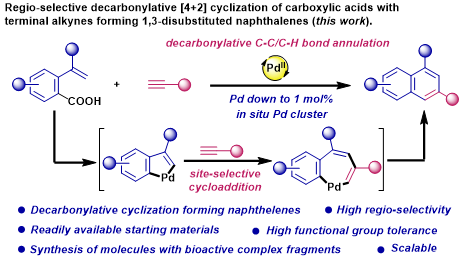 陈铁桥教授团队实现羧酸与末端炔烃的创新反应。此反应通过C-C/C-H键活化进行脱羰[4+2]环化,首次将羧酸用于分子内环加成,解决了取代萘区域选择性合成难题(如图1所示)。