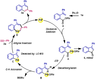 结合实验结果和文献报道,作者提出了一个可能的反应机理,如图4所示:首先,羧酸1a被Piv2O原位活化形成不对称酸酐4,然后Pd(0)氧化加成后脱羰得到芳基钯中间体B,然后进行分子内C-H活化形成五元钯环中间体C,紧接着与端炔选择性环化得到七元钯环中间体D,Pd(II)还原消除得到环化的萘环产物3a。GC-MS监测到如果反应条件不利于脱羰时,会直接与邻位烯烃环化得到少量的茚酮的副产物6。