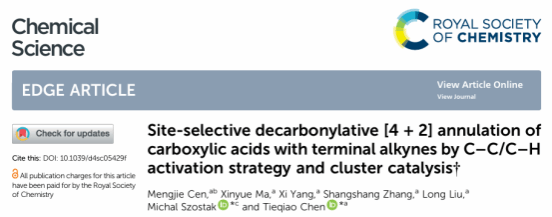 近日,陈铁桥教授团队在中科院一区Top期刊《Chemical Science》(IF = 7.6)发表题“Site-Selective Decarbonylative [4+2] Annulation of Carboxylic Acids with Terminal Alkynes by C-C/C-H Activation Strategy and Cluster Catalysis”的研究论文,私人直播