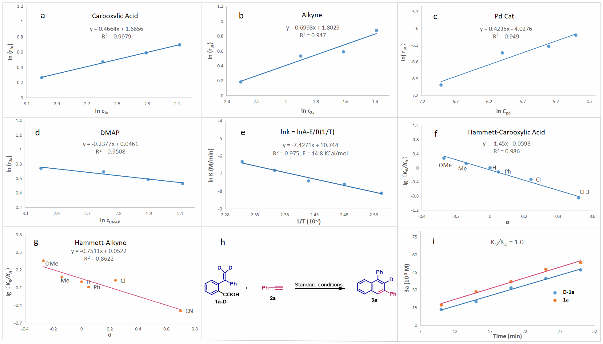 作者进行了动力学和Hammett分析实验(图2)。研究发现,该反应与1a及PdCl2呈0.5阶依赖关系(图2 a, c),与端炔呈0.7阶依赖关系(图2 b),与DMAP呈零阶依赖关系(图2 d)。根据反应温度效应计算出活化能为14.8 Kcal/mol(图2 e)。但该反应在160 oC下进行,其内在活化能超过30.0 Kcal/mol。作者认为该反应可能不是均相催化过程,而是多相催化过程。随后,进行了Hammett分析实验,当羧酸带有不同取代基进行反应时,得到负斜率(ρ = -1.45);对于不同底物取代的苯乙炔,得到较小的负斜率(ρ = -0.75)(图2 f, g)。KIE实验表明C-H活化不是决速步骤(图2 h, i)。这些实验结果与分子间竞争实验结果吻合较好,表明羧酸底物电子密度对反应具有显著影响。