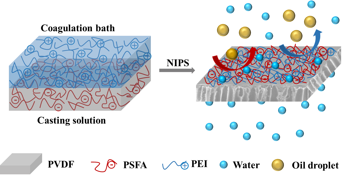 姜忠义教授团队利用静电相互作用增强的表面偏析法,以带负电荷的全氟磺酸(PFSA)作为铸膜液中的表面偏析剂,带正电荷的聚乙烯亚胺(PEI)作为凝固浴中的交联剂,构建了一种异质抗污染膜表面。PSFA与PEI之间的静电相互作用增强了表面偏析的驱动力,强化了PFSA的表面偏析以及PFSA和PEI的稳定性,从而分别构建了低表面能微区和亲水性微区。所得膜在水下表现出超疏油性和超低油粘附性。同时,PFSA的加入促进了相转化,提高了膜的渗透性。因此,我们的膜在分离各种表面活性剂稳定的水包油乳液时,表现出367 L m-2h-1的水通量,水通量恢复率超过95%。此外,经过三次循环过滤实验后,水通量恢复率仍保持在90% 以上。私人直播